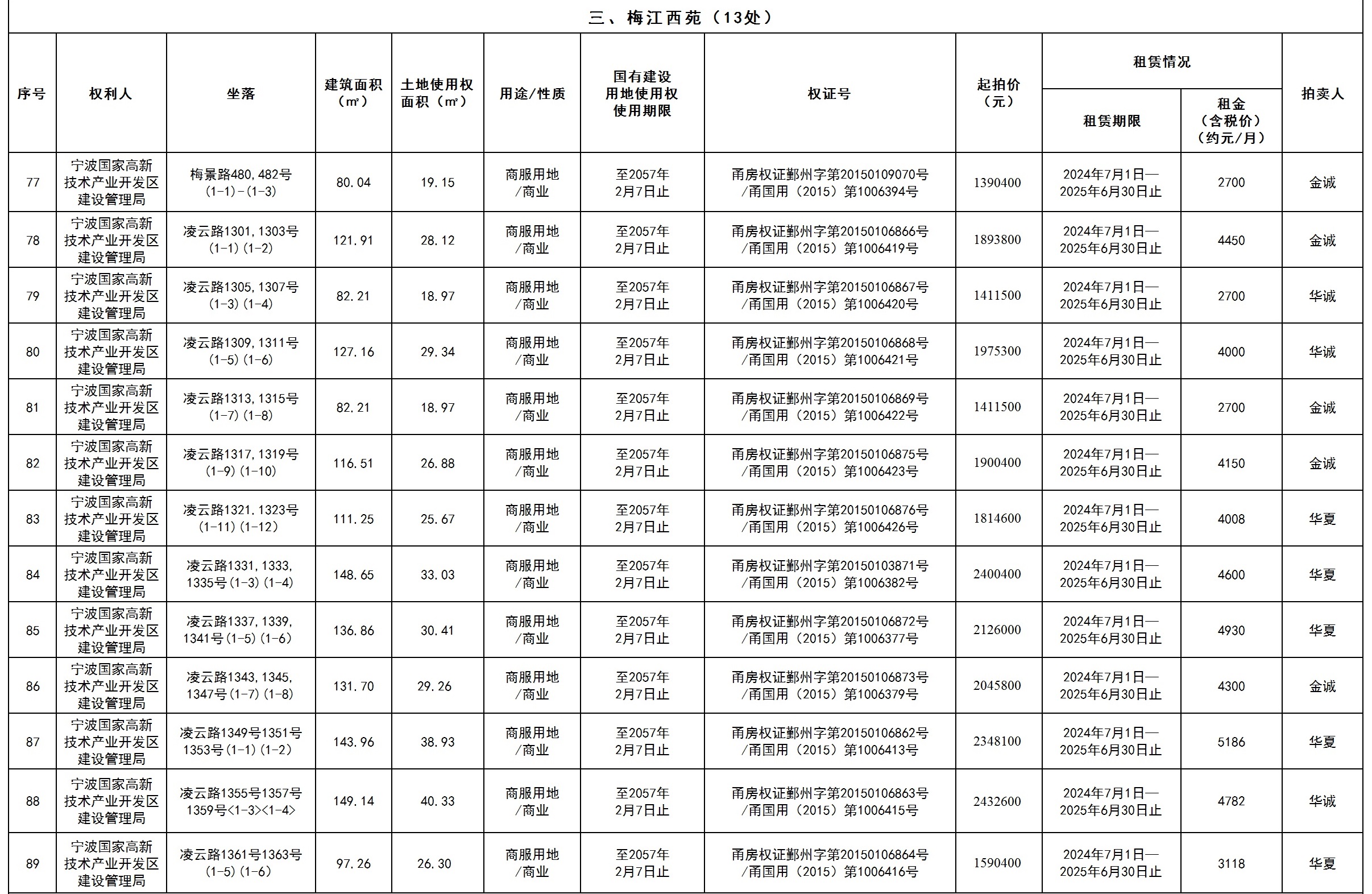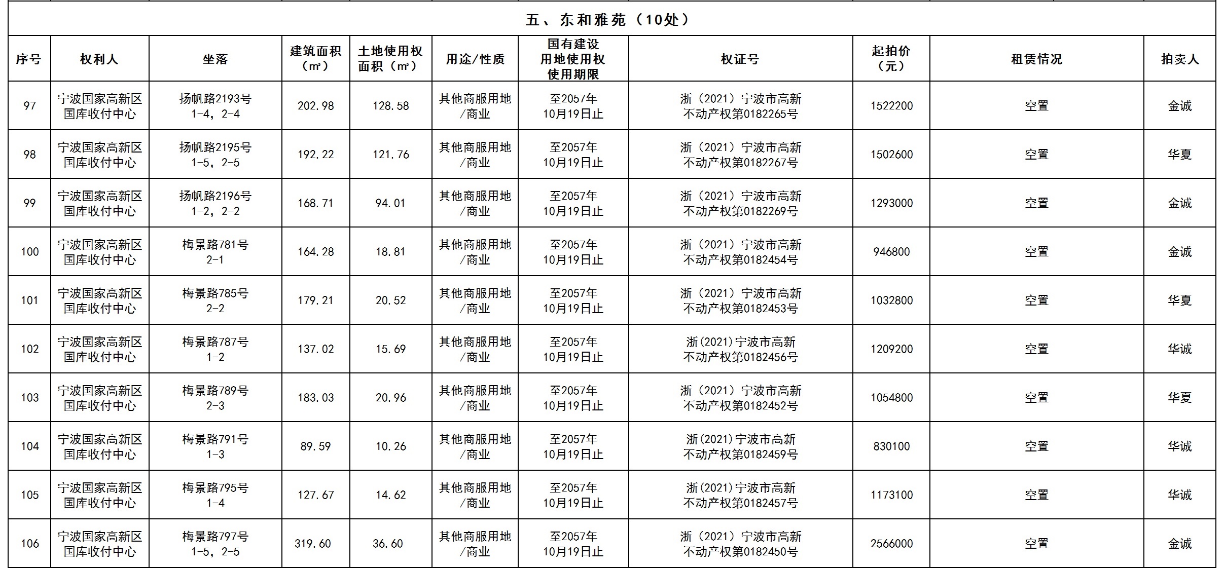 一、拍卖标的:宁波高新区存量商业用房116处,保证金15万/标的(不计息),如下表:
