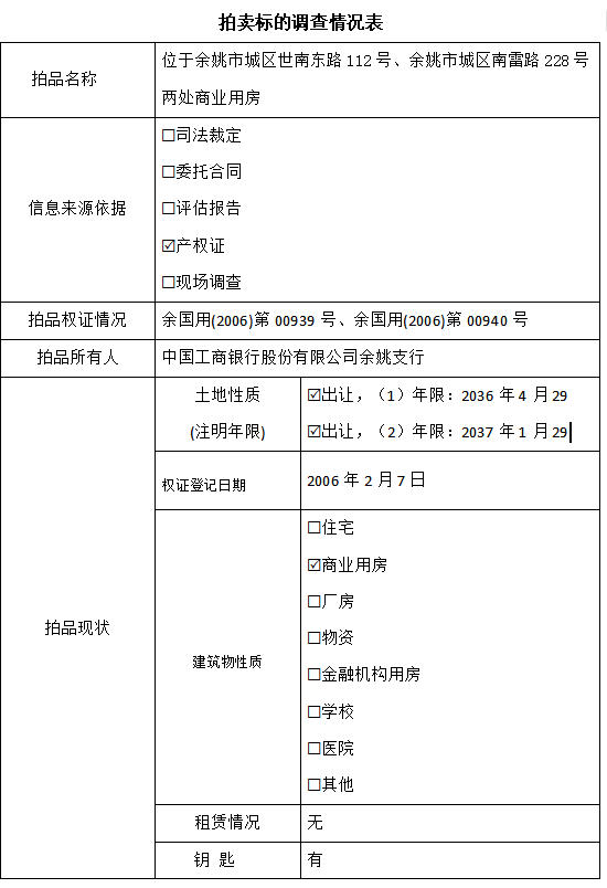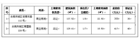 一、拍卖标的:余姚市城区世南东路112号、余姚市城区南雷路228号,共2处商业用房,详见拍卖公告。